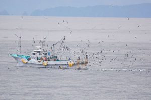10日、この日は過去データから出現率が上がる金華山沖の08:00から探鳥を開始しました。天候は良く風も穏やかでダウンジャケットがいらないくらいの陽気でした。光はまだ逆光ぎみでしたが次第に良い角度になりつつありました。早くもアビ、シロエリオオハムが飛び、08:30にはウトウの姿があり、その後は次第にカモメの姿が増えてきました。09:15にはクロアシアホウドリが飛び、10:00以降はやや風が出てくる中、カモメ、ウミネコ、オオセグロカモメが乱舞していました。11:00には列をなすように6羽のウトウが飛び、11:55には網を引きながら航行する漁船がいたことからアホウドリ3羽、クロアシアホウドリ3羽が同時に出現しました。アホウドリは美しい成鳥個体が2羽見られ、亜成鳥は高く舞い上がるようにしながら見事なダイナミックソアリングを見せてくれました。12:30を過ぎると次第に風が冷たくなる中、ようやくハシブトウミガラスが飛び、15羽ほどの群れで飛ぶウミスズメの群れがいくつか見られました。13:00を過ぎると真冬並みの寒さとなる中、時より吹雪がやってきてはまた晴れるといった状況が繰り返されました。ただ14:00にはようやく数十羽という小さな群れながらエトロフウミスズメが数回見られ、ハシブトウミガラス、コウミスズメが波間に見られました。15:30にも再度ウミスズメ類が多い時間帯がやってきてエトロフウミスズメ、コウミスズメ、ハシブトウミガラスの姿がありました。ただ、群れの規模はかなり小さく、個体数もかなり少なく残念でした。ただ薄暗くなりかかった16:50にはコアホウドリが連続して10個体ほど見られ、アホウドリ類3種を見ることができました。