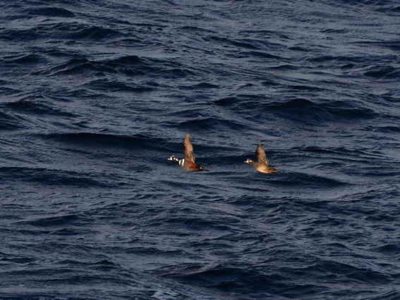 19日、この日は05:45の日の出よりも前の05:30から観察を開始しました。はじめは薄暗かったですが次第に空が明るくなり見事な日の出が見られました。この時間帯はさまざまな種に期待しましたが残念ながら出現はなく、カモメ、ウミネコ、オオセグロカモメが飛びかっていました。06:15にはこの海域では珍しいオオミズナギドリが複数飛び、07:30にハシブトウミガラスが連続して出現し、ようやく2羽のエトロフウミスズメが見られました。08:00にはオオハクチョウの群れが飛び、08:45にはシロエリオオハム、ウミアイサ、そしてウミウが飛び、09:40以降は所々海面が鏡のようになる中、浮いているハシブトウミガラスとウトウ、ウミスズメの姿を見ることができました。10:20には外洋では珍しく10羽ほどのヒドリガモが飛び、その後、11:30頃からはやや風が出てきたことから波が立ってきました。観察は金華山沖までとしていますが、この日はまだまだ観察を続けるお客様がいらっしゃったことから逆光を避けて反対側のデッキで観察を続けました。13:00頃には浮いているウトウが多数見られ、13:35にはクロガモが飛んで行きました。その後は海鳥よりもキタオットセイが目立つようになり、独特のポーズで浮いている様子やイルカのように跳ねる様子、頭だけを海面に出してこちらをうかがうような動作を楽しみました。またオオミズナギドリも頻繁に見られるようになり、そんな中、16:00には立て続けに3個体のトウゾクカモメが現れ、その中の1個体はしばらくに間、船体に沿うように飛翔してくれました。また16:18には遠くにシャチの背ビレが突き出しました。観察してみると背ビレの大きいオスとそれ以外にも数頭がいたことから家族群のようでした。その後はオオミズナギドリやウトウの姿を見ながら進み、最後は3羽のシロエリオオハムが船を追い越すように飛翔し、ふと下を見るとバタバタと羽ばたきながら水面を駆けるようにして逃げていく複数のシロエリオオハムの姿がありました。結局この日は17:00まで観察して終了しました。