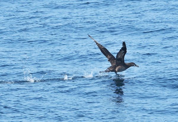 17日、通常は08:00の金華山沖からの観察ですが、6月は海鳥の出現が金華山沖のやや手前からであることが多いため07:00からとしました。一応、念のため06:30頃に順光側の左デッキに出ると早くもオオミズナギドリ、コアホウドリ、クロアシアホウドリが飛んでいました。天候は晴れで風も弱く、デッキ上の温度計は21℃でした。この時間帯はほとんど途切れることなくオオミズナギドリが飛び、コアホウドリの姿も目立ちました。07:15には早くも20羽ほどのクロアシアホウドリの群れがいくつか着水していて、それらが一斉に飛び立つシーンが見らえました。また網を引いている漁船がいたことから多くのウミネコが飛んでいました。また漁船付近ではオオミズナギドリも採食していて、一緒にカマイルカの群れも見られました。07:30には海上はかなりベタ凪となり、着水しているシロエリオオハム、ウトウの姿が見られ、08:30には再びオオミズナギドリとカマイルカが採食していました。09:10には10羽ほどのクロアシアホウドリが点々と着水しており、10:15頃からは水面がきれいだったことから小群で着水している冬羽に換羽中のカンムリウミスズメが見られました。7月にはよく見かけますがこの時期の観察は極めて珍しいことでした。ただ船が陸地に近づく11:30頃には海鳥の出現は一旦止まってしまい、時々着水しているクロアシアホウドリが見られる程度になってしまいました。13:00頃からは再びクロアシアホウドリが増えだし、14:30には個体数が増えてきました。またこの頃からは時よりハシボソミズナギドリの小群が飛ぶようになり、その中にアカアシミズナギドリの姿もありました。14:50にはようやく遠くを飛ぶオオトウゾクカモメが見られ、次第に船に近づく上空を通過していきました。15:05頃からはキタオットセイの愛嬌ある姿が目立つようになり、15:40には着水しているオオトウゾクカモメが海面から飛び立っていきました。津軽海峡に差し掛かった16:20頃からは状況は一変して風が吹き出し、波が立ってきて一気に寒くなってきました。このタイミングに合わせたかのように数千羽クラスのハシボソミズナギドリの大群が乱舞しはじめ、デッキ上は一気に忙しくなってきました。よく見るとハイイロミズナギドリ、コアホウドリも数多く混じっていて、風に乗るようにスイスイと飛翔しながら船体のすぐ脇を次々に通り抜けていきました。津軽海峡を通過した頃には再び海況は穏やかになっていましたが、ハイイロウミツバメが見られたほか、18:30には遠くを飛び白色型フルマカモメの姿があり、次第に船体に近づいてきて飛翔してくれたことからじっくりとその姿を観察することができました。6月はいつまでも明るいため結局19:00まで観察し、その後は慌てて荷物整理をして20:00前に下船しました。