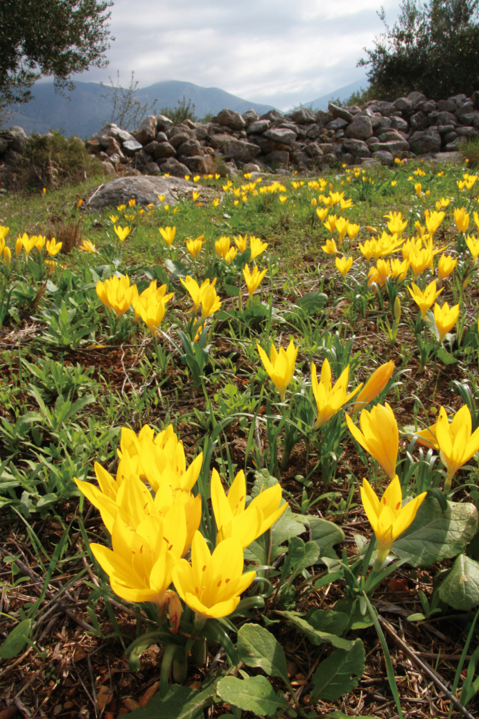 わずかな場所の違いで、2種の秋咲きのシクラメンが咲いています。花の咲いたあとの種子をつけた茎はきれいなコイル状になるか、ジグザグに曲がるかの違いで区別できます。マニ半島の石灰岩の多い荒地には白からほんのりピンク色のクロッカスや、秋咲きのほっそりしたスイセン、甘い香りのエリカが咲きます。さらにペロポネソス半島特産のクロッカス・ゴウリミイが咲き乱れるパラダイスがあります。周囲を明るくするように、薄紫の濃淡のある丸みのある花弁に黄金色のしべが美しく、大柄な黄金色のステルンベルギア・ルテアが秋の日差しを浴びて輝いています。途中の岩場にはカンパヌラも咲いています。クロッカス・キャンセラーツスやハドリアティクスのすがすがしい色に加えて、赤い雌しべが印象的なクロッカス・カートリティアヌスも観察予定です。景色の美しいモネンバシアも訪れ、前回は途中でなぜか春のスイセンやアネモネも観察できました。できるだけ連泊を心がけ、海辺の町なので素朴な魚料理も楽しみです。イギリス人のクリスのガイドも好評で、クレタ島でも人気でした。