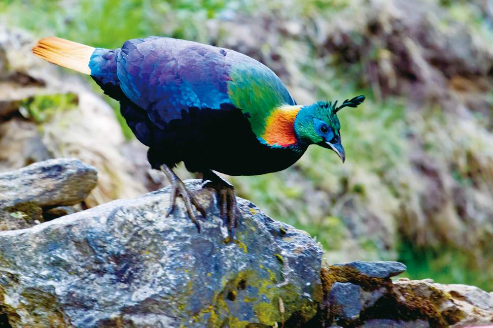 このツアーは、ヒマラヤ東部でのみ見ることができる鳥を探すため、東部のリミタンまで行きます。標高3,800mのトンシンラ峠から、つづら折れの道が急峻な山腹を巻きながら、標高640mのリミタンまで急勾配を下ります。上部はシャクナゲと針葉樹の森。途中は緑したたる広葉樹林。谷底のリミタンはナナミゾサイチョウも生息する亜熱帯の植生です。この、直線距離にしたら30㎞にも満たない地域に、ヒオドシジュケイやニジキジ、ヒマラヤイワヒバリやユキバトなどの高山の鳥から、カオグロオナガやアオムネハチクイなどの熱帯林の鳥まで、それこそ千差万別の鳥が生息しているのです。真紅の尾と緑に輝く身体のゴシキチメドリや、大型のビナンゴジュウカラなど、ヒマラヤ東部でしか見ることのできない、美しい鳥たちが待っています。