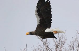 13日、早朝に-12℃まで気温が下がったそうでかなり冷え込んだ状況の中を08:00に出発しました。相変わらず積雪はほとんどないものの空はすっきりとした青空で、この日も雨や雪の心配はなさそうでした。ひとまず1時間ほど走って一旦休憩をとり、さらに40分ほど走って最初の目的地までやってきました。さすがに上流方向に向かうと次第に積雪が増え、最初に止まった場所ではしっかりとした積雪の中、川に入って餌を探すカワガラス、そして木々にはオオワシ、オジロワシの姿がありました。次に止まった場所では雑木林にハシブトガラ、シジュウカラの姿があり、川には今度は2羽のカワガラスの姿があり、うち1羽は岩に止まってさえずっていました。少し歩くと対岸の木に止まるオジロワシの成鳥の姿があり、オオワシの亜成鳥が飛翔してくれました。そして最後に止まった橋の上では再び木に止まっているオジロワシ成鳥、さらにはふいに飛んできたオオワシ成鳥を間近に見ることができ、川をのぞき込むとホオジロガモやカワアイサの姿もありました。その後は一旦休憩をとり、その後は河口に向かいました。まず橋の上から河口方面を見てみると枯れ木には複数のオオワシ成鳥が止まり、オオハクチョウが餌をもらおうと寄ってきました。またホオジロガモに混じるミコアイサのオスなどを見てから河口に移動し、河口ではアカゲラの姿があったほか、ワシカモメ、そして飛び回るカモメが見られ、海上にはホオジロガモ、クロガモの姿がありました。その後はさらに南へ移動しました。ただその途中、バス車内から飛び回るレンジャクの群れが見えたことから安全なスペースまで移動してバスを止めて周辺を探してみると、漁港脇の木の実に群れるヒレンジャクの群れが見られ、群れで飛び回る様子を上から眺めるという珍しいシーンに出会うことができ、その後はヤドリギにやってきてくれたことから望遠鏡を使って観察すると、100羽ほどのヒレンジャクの群れの中に3羽のキレンジャクを見つけることができ、カラマツに群れて止まる様子などをじっくりと観察することができました。その後は移動して休憩をとっていると、別の群れなのか10羽ほどのレンジャク類が飛び回っていて、やはりこの冬は冬鳥の飛来状況が良いことを印象づけてくれました。その後は漁港でホオジロガモ、カンムリカイツブリを見てから移動しようとすると、漁港内の空き地をノコノコ歩くコクガンの群れがいたことからバスを降りて観察していると、全く警戒心がないようで見る見るうちに間近までやってきて最後は寝てしまいました。そのなんとも可愛らしい姿に思わずほっこりとした印象を残してこの日の探鳥を終了しました。