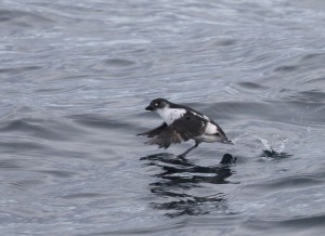 3月中下旬は渡りを控えたウミスズメ類が群れを形成する時期のため観察が容易な時期で、文字通りウミスズメ類観察のピークです。航路上は至るところでウミスズメの群れが見られ、北の海域に進むにつれてウトウ、ハシブトウミガラスの姿が多くなってきます。この3種をウミスズメ類の基本3種としてしっかり覚えていただけるよう識別ポイントを事前にお伝えいたします。
