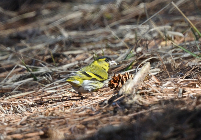 11日、この日も幸いなことに早朝から快晴。08:00に出発して現地に向かうと、遠く八ヶ岳、車山、北アルプスの山々もはっきりと見ることができました。小道を歩きはじめると早速、コガラ、ヒガラ、ヤマガラ、コゲラの混群が出迎えてくれ、しばらくの間、コミカルに動き回る小鳥たちの姿を楽しみました。ひとまずこの日も午前中は同じ場所で待機するために歩きましたが昨日いたものと同じ個体と思われるマヒワが2羽、間近を歩いて採食していました。ほかにもホオジロが地面で採食していて、いつの間にかカヤクグリも現れました。現地ではひとまずイスカの登場を待つことにしましたが、この日もなかなか姿を見ることができず、上空を飛翔するノスリ、魚を捕らえてどこかに運ぶミサゴ、またカラマツにやってきたカシラダカを見て過ごすに留まりました。時間もお昼に近づいたことから一旦戻って昼食の時間とし、その後は再び同じ場所に行ってみました。ただどうにも動きがないことから少々小道を歩くことにすると、周辺からイスカの声が聞こえました。なかなかしっかり観察できる状況にはなかったですが、鳴きながら飛ぶ姿や松の木にとりついている姿、そしてようやくメスが松の木に止まったところを望遠鏡で見ることもできました。また周辺の斜面からはこの日もオオマシコの声が聞こえ、道端に出てきて採食している様子も観察することができたほか、クマタカを観察したお客様もいらっしゃいました。その後は再び来た道を戻って行くと、ようやくカラマツに止まっている1羽のイスカのメスに出会うことができ、望遠鏡を使ってじっくりと観察することができました。時間もなくなってきたことからそのままやや延長してイスカの出現を待ってみましたが、この後はベニマシコやマヒワの姿を見ることはできましたが、イスカの登場はなく探鳥を終了しました。