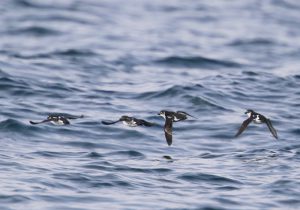 そして最終日は漁船を使用しウミスズメ類を間近に撮影できる落石クルーズに乗船します。主役はウミバトですが、ほかにもハシブトウミガラス、ウミガラス、ケイマフリ、コウミスズメ、エトロフウミスズメ、過去にはツノメドリを見られています。なお、海況悪化等により落石クルーズが欠航になった場合は花咲漁港などをめぐります。ツアー全行程を通して防寒装備が必要なほか、船上からの観察では海水の付着対策として雨具が必要です。またフォトツアーではガイドは望遠鏡を持参いたしません。