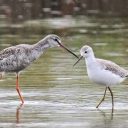 14日、この日は早朝の塒立ちを観察するためホテルを出発しました。ただこの日は天気予報は良かったものの、すでに霧が立ち込めていてどうなることやらといった感じでした。現地に到着後は各自準備を進めましたがこの日は日の出時間の06:15になっても視界が開けることはなく、日の出から30分ほど過ぎた頃からようやくガンたちの塒立ちが始まり、一斉にとはいかないものの霧の中から次々に飛び立って行く様子を観察しました。観察後は一旦ホテルに戻り、朝食をいただいてから再度出発して化女沼に向かいました。到着するとベニマシコの声が聞こえ、しっかりとはいかないもののオス、メスが草の実を食べている姿を見ることができました。またジョウビタキ、そして湖面にはホシハジロ、ヒドリガモ、ヨシガモ、キンクロハジロ、コガモなどの姿があり、上空をマガン、オオハクチョウが飛んでいました。その後はシジュウカラガンの群れを探すことにしました。現地では広大な畑地をめぐりましたが、幸いなことにいきなり10羽ほどのシジュウカラガンの小群に出会い、次に訪れた場所ではマガンと共に地上採食している100羽ほどのシジュウカラガンを見ることができ、かなり良い距離感から観察することができました。その後は一旦各自昼食の時間とし、昼食後はヒシクイのポイントに向かいました。逆光に輝くススキを見ながら歩くとホオジロの姿があり、現地では群れるヒシクイを間近に堪能することができました。帰りに湖面を見るとチュウヒが間近を低く飛び、ヨシガモ、カワアイサの姿があり、次々に飛んでくるマガン、ヒシクイ、オオハクチョウが見られ、珍しくオオタカ幼鳥がしばらくの間、我々の頭上を旋回飛翔してくれました。さらに歩くとどこからともなくマガンの群れが飛んできたためよく見ると、その中にハクガンの姿があったことから付近の地上にいた群れを見てみました。すると数百羽はいるだろうと思われる大きなマガンの群れの中にたった1羽混じるハクガン幼鳥を見つけることができ、しばらくの間、観察することができました。その後は昨日、バッチリ撮影ができなかったカリガネを再び探してみることにしました。するとこの日もあっさりと群れを見つけることができ、この日はそれほど警戒していなかったためバスを降りて少しずつ距離をつめながら観察、撮影してから再び塒入り観察に向かいました。この日は前日に比べると西の空の雲はかなり少なく期待できそうな状況で早くも湖面には次々にヒシクイがやってきていて、チュウヒ、ハイイロチュウヒが飛んでいました。そして西の空が赤く焼けてくる頃にはシジュウカラガンの群れが次々に飛来し、薄暗くなってきた頃からは東側から大きな群れがいくつもいくつもやってきて我々の頭上を越えていきました。結局この日は前日よりもかなり多くのガンが着水したようで、最後は湖面を覆い尽くすほどのガンたちを見ながら17:00まで観察してツアーを締めくくりました。