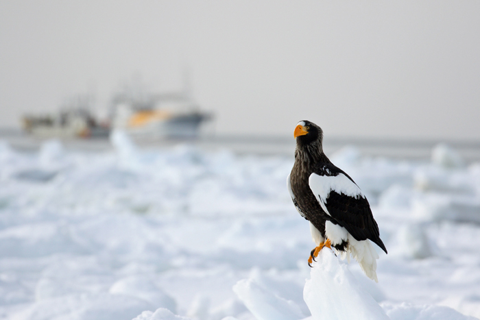 18日、この日は早朝に出発して羅臼町に向かいました。以前は05:30の早朝便の流氷観光船に乗っていましたがなかなか日の出に出会えないこと、そして日の出が見られないと光線の関係で1時間ほど撮影ができないことから、今回は午前便に乗船することにしました。中標津町を通過する頃にはうっすらと日の出を見ることができましたが、標津町から海が眺められるあたりまでくると空は曇り、沿岸部までびっしりと流氷が押し寄せてきているのには驚きました。羅臼町に近づいてくると一旦、流氷がなくなっていて焦りましたが、さらに進むと見事な流氷が海を覆い尽くしていました。一時的に雪が舞ってはいましたが到着後は次第に空が青くなってきて狙い通りといった状況になりました。乗船後はわずかな時間で流氷までたどり着くことができ、見る見る青空が広がってくる中、2時間に渡ってオオワシとオジロワシの撮影を行いました。この冬は全体的にオオワシの個体数が少ないといった印象ながらも間近にある流氷に止まる様子や餌を求めて間近を飛翔する様子など、迫力ある巨大なワシたちをたっぷりと撮影することができました。その後は野付半島に向かいましたが、沿岸を流氷が埋め尽くしてしまっていたため海ガモ類は見られず、仕方なく小雪が舞い始める中を移動し漁港までやってきました。ここでは一部に氷が入り込んでいたものの、そこにはオオセグロカモメ、シロカモメ、ワシカモメが並び、目的だったコオリガモも撮影することができました。またほかにもヒメウ、シノリガモ、ホオジロガモ、スズガモ、ウミアイサの姿もありました。その後は根室に向かい、最後は風連湖の南端、春国岱で沈んでいく夕陽を見てこの日の撮影を終えました。
