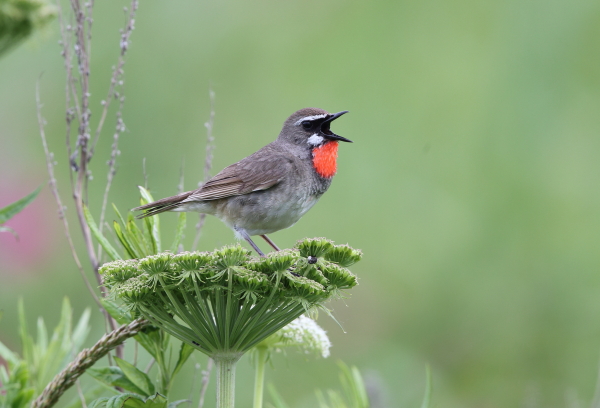 翌日は午前中にヒグマを観察するクルーズに乗船し、雄大な知床の山々の景観にマッチした親子連れのヒグマを探し、午後は知床峠でギンザンマシコを探します。なお、クルーズ欠航時や知床峠悪天候の場合は先を急ぎサロマ湖周辺の原生花園で小鳥類観察に時間を使います。最終日はオホーツク海沿いの原生花園をめぐります。この時期はシシウドやハマナス、エゾカンゾウ、センダイハギ、エゾスカシユリなどの花々が咲き、サロマ湖では主にノゴマやオオジュリン、その後は紋別方面に向かいツメナガセキレイ、マキノセンニュウ、シマセンニュウ、ベニマシコ、アリスイが多い場所をめぐります。クルーズ乗船時、またオホーツク海沿いでは特に早朝に冷え込みますので防寒装備をお持ちください。