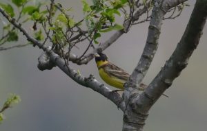 夜に雨がかなり降ったようで、ホテルの窓に大粒の雨粒が幾つもついています。外に出ると霧雨が降っているものの、雨雲も薄くなっており、今日の天気は大丈夫そうです。2日目の本日は先ずは水田まで向かいますと、サギ類が多く群れており、アオサギだけで30羽以上集まっていましたがが、サギ類以外の鳥影は薄く、鮮やかな黄色が美しいツメナガセキレイを1羽確認するにとどまりました。次いで向かった探鳥地はどちらも今ひとつのまま、午前中の探鳥を終えるとオウチュウが出ているという話が舞い込んできましたので、午後はまず向かいますが、現地にいた方に伺うと、すでに飛び去ってしまい行方不明になっているとのことでした。飛び去った、という方向へ歩いて探してみますが見つからなかったのですが、戻る途中で国内では観察する機会の少なくなったシマアオジを観察することができました。その後、昨日も訪れた水田を歩くとコホオアカやキマユホオジロの姿が見つかったことから、昨晩の雨で多少、ホオジロ類が入ってきたようです。そして途中で出会ったバーダーからシマノジコ雄の写真を見せてもらい、話を聞くと、つい先ほど出てきたということでしたので、急ぎその場所に向かって、探すと2羽の雄のシマノジコが現れ、美しい色を楽しませてくれました。
