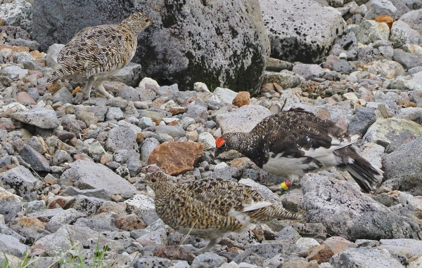 19日、この日の都内は早朝から薄曇りながら、とにかく蒸し暑く、週末ということもあって混雑している東京駅は、人込みが蒸し暑さを助長しているかのようでした。ひとまず集合時間よりも30分ほど早く富山駅に到着する新幹線に乗り、到着後は待合室で昼食をたべてから集合場所に向いました。ただこの日の富山市内は気温が37.3℃とのことで頭がくらくらするほど暑く、いつに間にか空は真夏のような青空でした。ご集合いただいた後は資料を配布してからバスにご乗車いただき、この日の宿泊地である標高2300ⅿの弥陀ヶ原を目指して出発しました。途中、昼食の時間をとるため道の駅に立ち寄って各自、昼食をとっていただき、その後はいよいよ弥陀ヶ原に向けてバスを進めました。この時点では周辺はほぼ快晴ながら室堂方面には黒い雲がかかっていて、どうなることかと心配でしたが、その後はバスが進んでも雲は広がっておらず、霧もかかっていなかったことから、途中、その落差が日本一の称名滝を見ることもできました。その後もバスはグイグイ山道を登り、左手に弥陀ヶ原の高層湿地が見え始めると、ようやく今回お世話になる宿が見えてきました。宿に到着後はロビーをお借りして観察機材の準備をしていただき、再度バスにて出発して室堂に向かいました。空は一部に青空が見えるものの山々の頂を隠すように雲がかかっていました。室堂駐車場でバスを降りると、それほど寒さを感じることはありませんでしたが、やや強い風が吹いている中をイワツバメが飛び、山の斜面には雪がまだまだ残っているのが見えました。室堂平に出るとすでに見ごろは過ぎているものの、チングルマやイワカガミ、イワイチョウ、ヨツバシオガマの花が咲き、そのまま歩いてみくりが池周辺の斜面を見てみました。すると斜面にへばりつくようにライチョウのオスが見え、夏季にはなかなか見ることができないだけに驚きました。ただ周辺にメスやヒナの姿がなかったことから、その後は室堂平内を歩きながらライチョウを探しましたが残念ながらライチョウの姿はなく、来た道を戻りました。すると斜面にライチョウのメスの姿があり、よく見ると間近には2羽のヒナの姿がありました。しばらく観察しているとハイマツの中からメスが2羽現れてこの親子に接近すると、ヒナを連れたメスがその個体を追い回して威嚇する様子が見られました。さらに観察を続けると2羽のメスは速足でどんどん近づいてきて、そこをめがけて1羽のオスがやってきました。その後はさらにもう1羽、オスが加わり計4羽のライチョウがけん制しあったり、砂浴びをしたいとかなり良い動きを見せてくれ、気が付くと17:30になっていたため、急いで宿に戻りました。結局、この日は雨に打たれることはなかったものの、夜には霧が立ち込め雨が降ってきました。