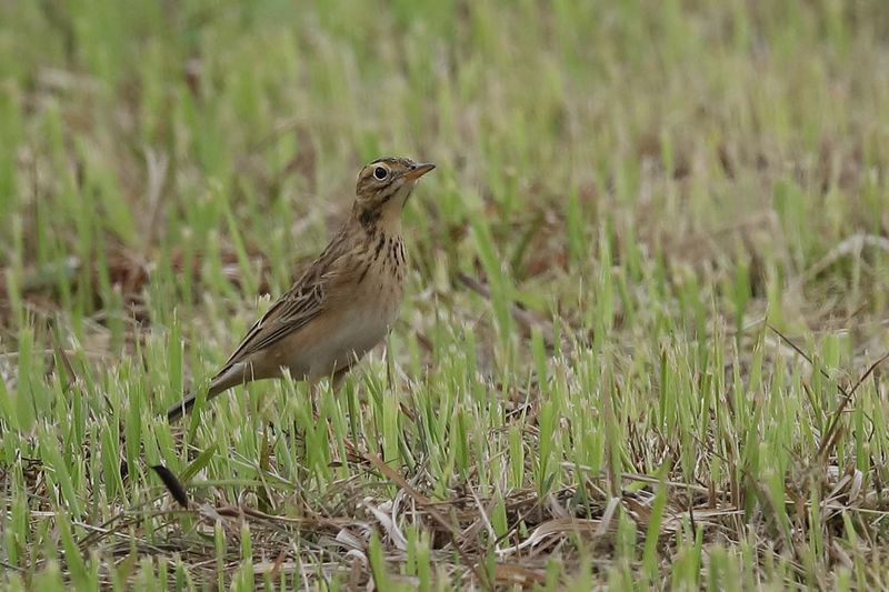 5月7日、05:30。ホテルの周辺で鳥を見る。島の最高標高の尾岳(604m)に続く道路を歩くと、カラスバトの姿や声が目立つ。アカショウビンやサンコウチョウ、ヤブサメが囀る。朝食後は水田が広がっている場所に行ってみたが、アカガシラサギ、ツバメチドリ、ツメナガセキレイ、数羽のコホオアカがいる。マミジロタヒバリや亜種シベリアアオジもいる。そんな中、オウチュウを発見。なんと、耕作地と中学校に合計7羽もいる。そして、一部のお客様がキガシラセキレイの冬羽を観察したのである。午後は、海岸に行く。ここにはミサゴの巣があり、距離は遠いけど展望台から巣内が見えるのだ。巣内では雌が抱卵していた。暫くすると雄が大きな赤い魚を持って来て、雌に渡すと、雌はそれを持って巣から飛び立ち、代わって雄が抱卵をする。こんな、決定的瞬間をみなさんでじっくりと観察・撮影する。さらに、夕方、再び、水田に行くと、コホオアカやアオジに混じってシマアオジのような鳥がいる。どう見てもシマアオジなのだが、頭部の栗色の部分が黒く、背、肩羽、腰の茶褐色も乏しい。一瞬、ズグロチャキンチョウが脳裏をよぎる個体なのである(後にシマアオジ雄の第一回夏羽にこのような個体がいることが判明)。さらに、ノジコやムネアカタヒバリ、亜種シベリアツメナガセキレイなどを見てホテルへ帰ったのである。