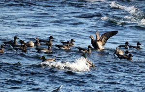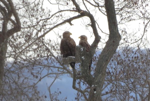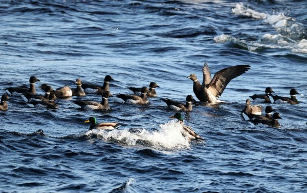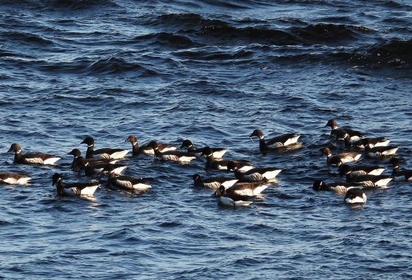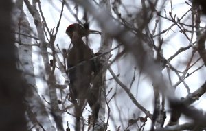 18日、この日は早朝の気温が−7℃と冷え込んでいて、空は見る見る青空が増えてきていました。朝食後はコクガンを探すため海岸に向いました。海岸が近くなってくるとやや風が出てはきましたが天気はさらに良くなっていてほぼ快晴でした。ひとまずコクガンの姿を探しながら海岸線を走り、毎回よく見られている場所までくると驚いたことに100羽近いコクガンが群れていました。バスを降りて観察をはじめると群れは大きな塊のようになって移動し、右に行ったり左に行ったりしていておもしろい動きを見せてくれました。過去、毎回見てはいますがここまでの数の群れは見たことがなく印象的でした。また海上にはアカエリカイツブリの姿があり、周辺では風に乗るようにオオセグロカモメ、シロカモメが飛んでいました。観察後はトイレに立ち寄りましたが、ここでも間近に海藻を食べている10羽ほどのコクガンを見ることができ、ホオジロガモの群れが飛び回っていました。その後は大沼公園まで戻ってヤマゲラなどの小鳥類を探してみました。駐車場付近では早速、ハシブトガラ、ヤマガラ、シジュウカラ、シロハラゴジュウカラが間近に見られ、森に入るとここでもハシブトガラ、ヤマガラ、シロハラゴジュウカラ、そしてアカゲラも見られましたが鳥影が薄かったことから、キャンプ場まで行ってみることにしました。バスを降りると上空を2羽のオジロワシが飛んでいたもののここでも小鳥の気配は薄く、戻ろうかと思った時、遠くから「コロコロコロ・・・」というクマゲラが飛翔時に出す声が聞こえたため見てみると、飛んできたクマゲラが木に止まり、今度は止まった時によく出す「キョーン、キョーン」という声で鳴きだしました。望遠鏡で見てみるとオス個体で枯れ木をつつく様子が見られるなどラッキーな出会いがありました。その後は2羽で仲良く止まっているオジロワシを見てから再び大沼公園まで戻ると、小さな池にはアオサギ、ダイサギの姿があり、その後は森に入りましたが、ここではハクセキレイ、ミソサザイ、ベニマシコが見られたのみで新た出会いはなく、この日の探鳥を終えました。